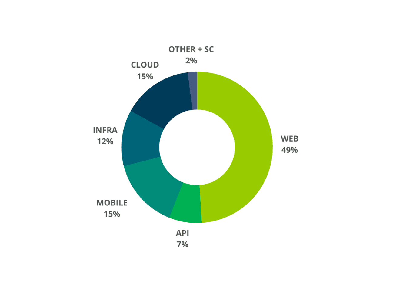 Web-based projects, including websites and APIs, made up the majority of projects we tested, accounting for 49.1% of all projects. Mobile app projects were the second most common type at 15.3%, followed closely by Cloud at 14.5%.